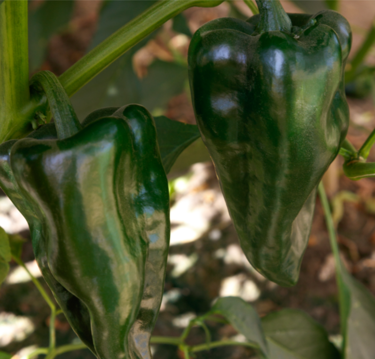 An improvement on the “Mosquetero” type that it replaces. Our new hybrid ancho or poblano type is extra-large and performs even better under cool conditions! Vigorous producer of smooth, dark green, glossy, two-lobed fruits that taper slightly to a flat point. Enjoy an extended harvest from productive, tomato mosaic virus resistant plants. Medium heat. Widely adaptable. Ideal for stuffing into chiles rellenos or for frying.